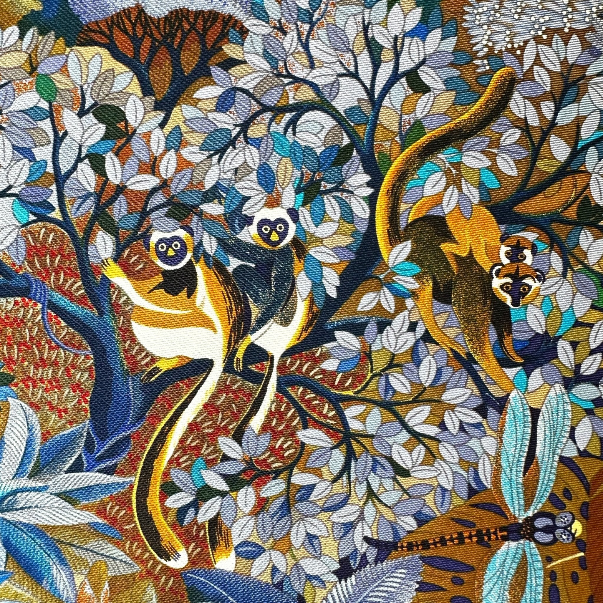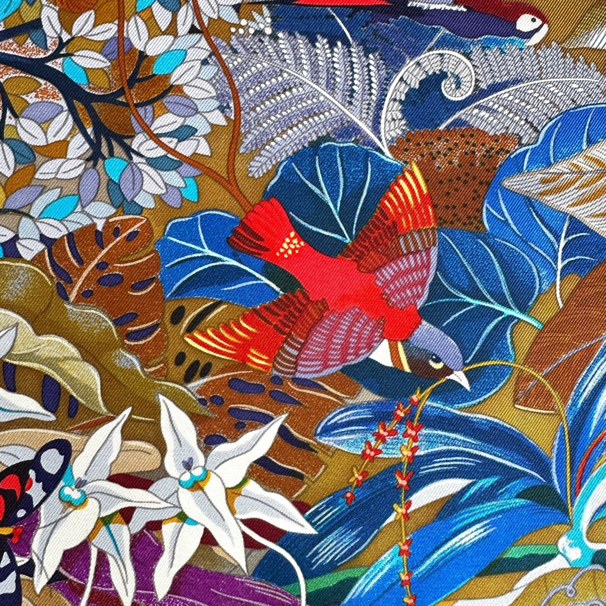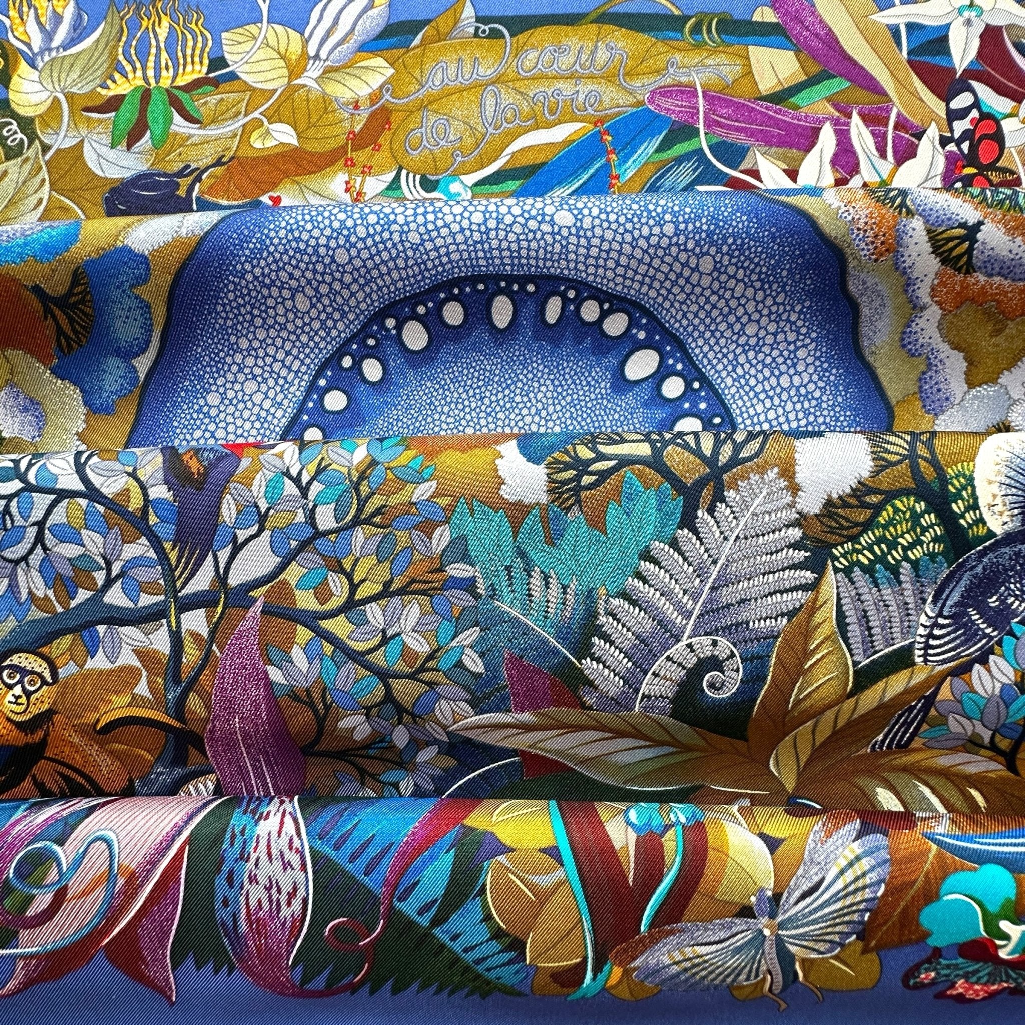 Créé en 2007 par Aline Honoré et réédité en 2014, Au Cœur de la Vie est un carré remarquable par la richesse de son motif et son symbolisme. Il nous plonge dans une nature luxuriante, foisonnante de détails, où la flore et la faune se mêlent avec une rare finesse graphique.